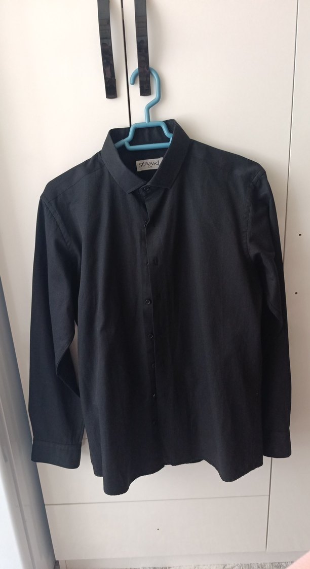 Erkek siyah renk, uzun kollu, düğmeli ve slim fit gömlek. Sentetik kumaştan üretilmiş olup ofis için uygundur.