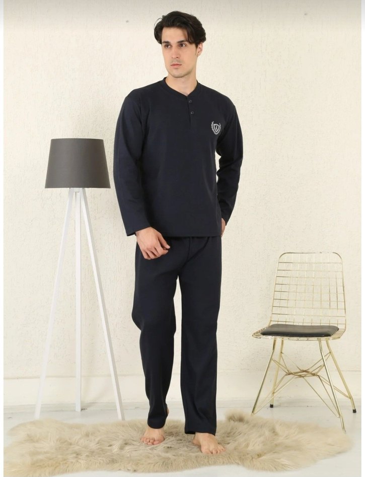 Erkek pijama takımı, bisiklet yaka ve uzun kollu, normal kesim ve uzunlukta. Siyah renkte, desensiz ve rahat, zahmetsiz şıklık sunar. Tüm bedenler mevcuttur.