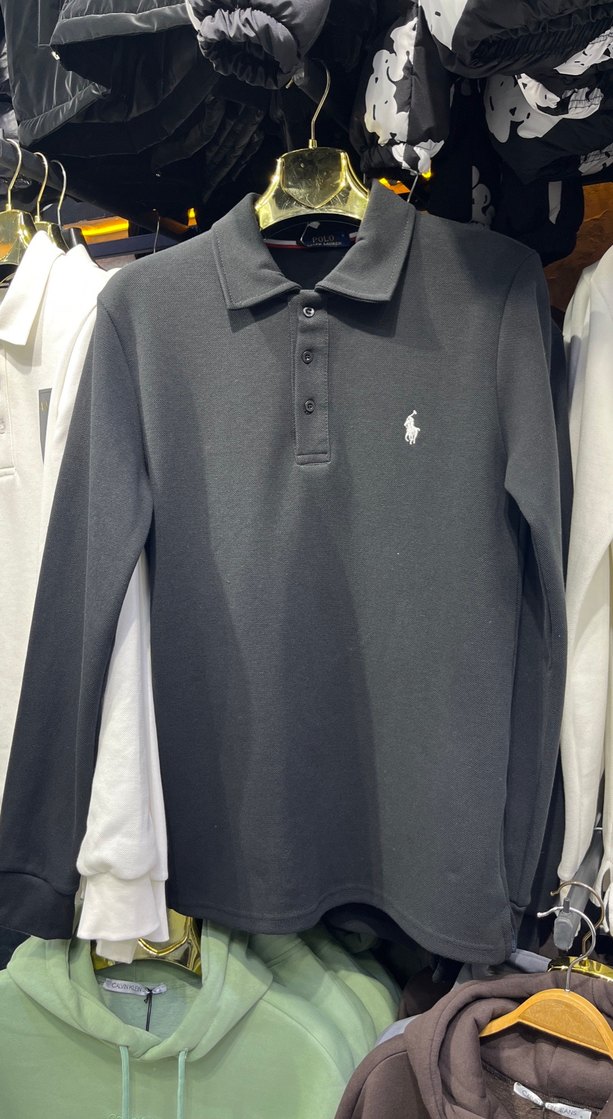 Erkek siyah uzun kollu polo tişört, yakalı ve düğmeli. Rahat kesim ve yumuşak, sıcak kumaştan, günlük sokak stili için uygundur.