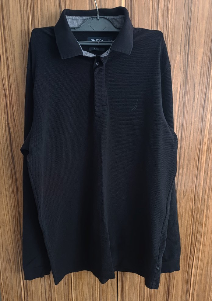 Siyah renkli, düğmeli yakalı ve uzun kollu erkek polo tişörtü. Yumuşak ve sıcak kumaştan, günlük rahat sokak stili için uygundur.