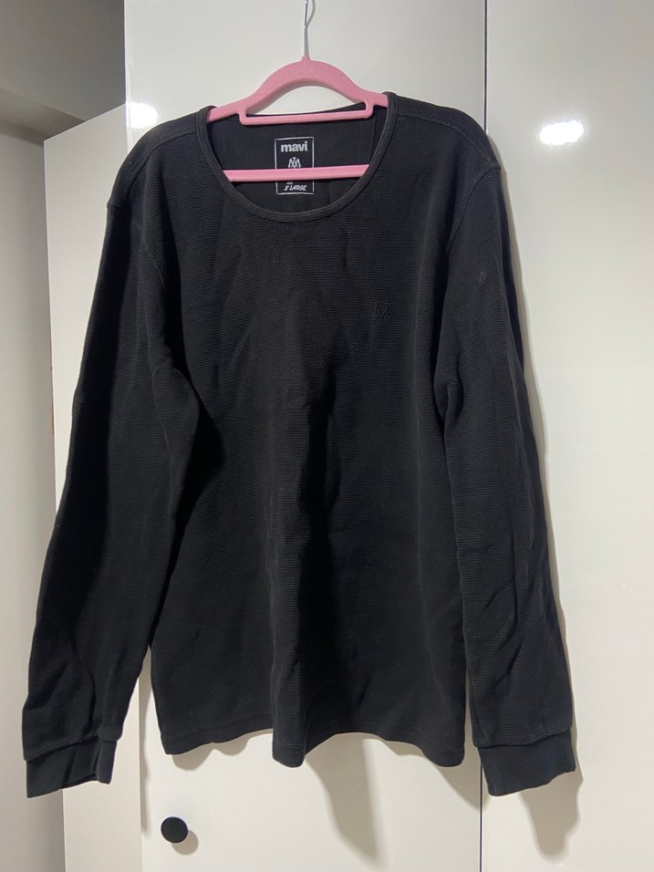 Siyah, uzun kollu, yuvarlak yakalı ve salaş kesim sweatshirt. Yumuşak ve sıcak kumaştan üretilmiştir. Günlük sokak stili için uygundur. Waffle kumaş diye geçiyor sanırım. Kolunda kullanıma bağlı deforme mevcut.