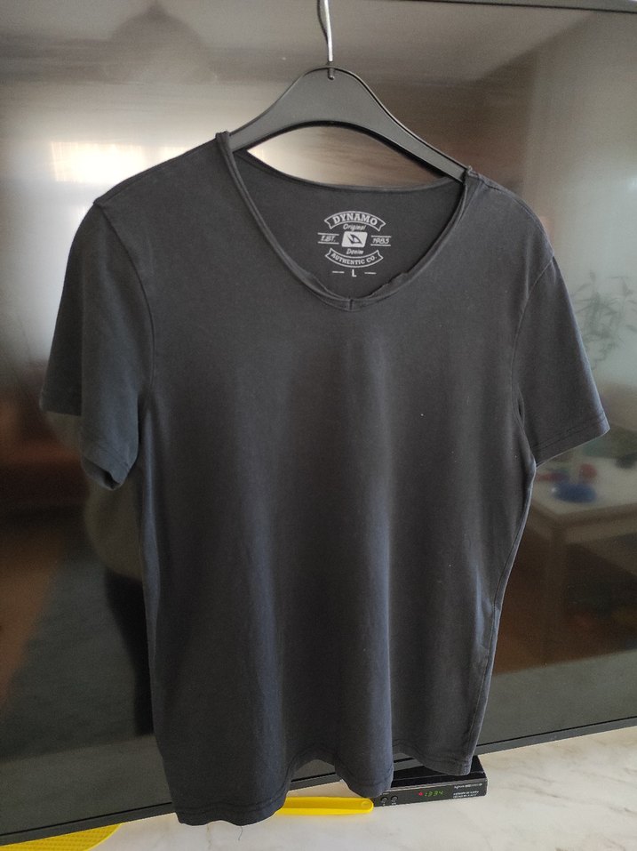Erkek siyah V yaka tişört, kısa kollu ve bol kesimdir. Yumuşak pamuktan üretilmiş, günlük kullanım için rahat ve baskılı tasarıma sahiptir. marka temsilidir