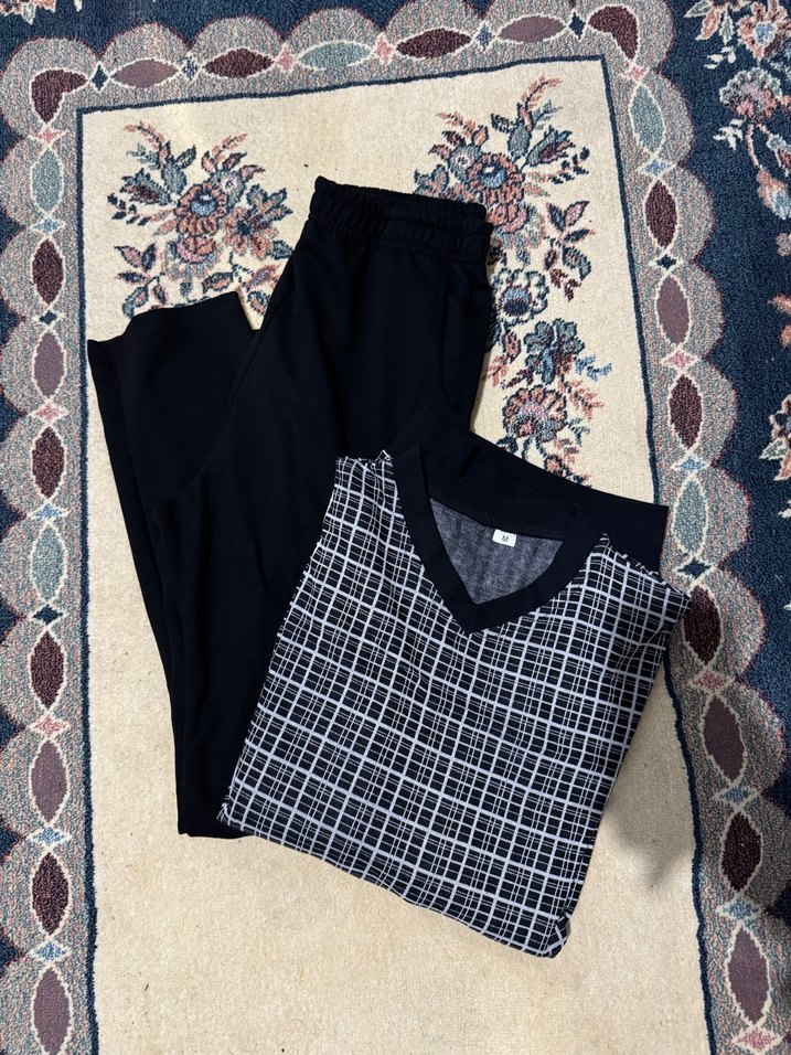 Erkekler için siyah V yaka uzun kollu, kare desenli üst ve elastik bel bantlı siyah pantolonlu rahat pijama takımı.