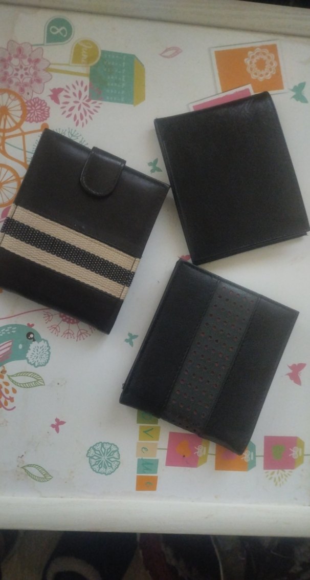 Üç farklı tasarıma sahip siyah erkek cüzdanı, biri çizgili kumaş detaylı, diğerleri düz yüzeyli, klasik tarz için uygun. 1 Adet fiyatıdır.