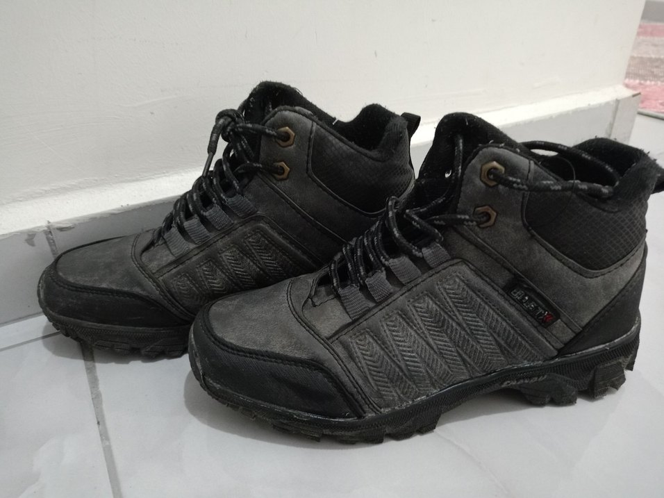 Siyah yılan desenli, bağcıklı erkek outdoor botları, spor biker tarzı ve dayanıklı kauçuk malzemeye sahip. yeni gibi çok az kullanıldı