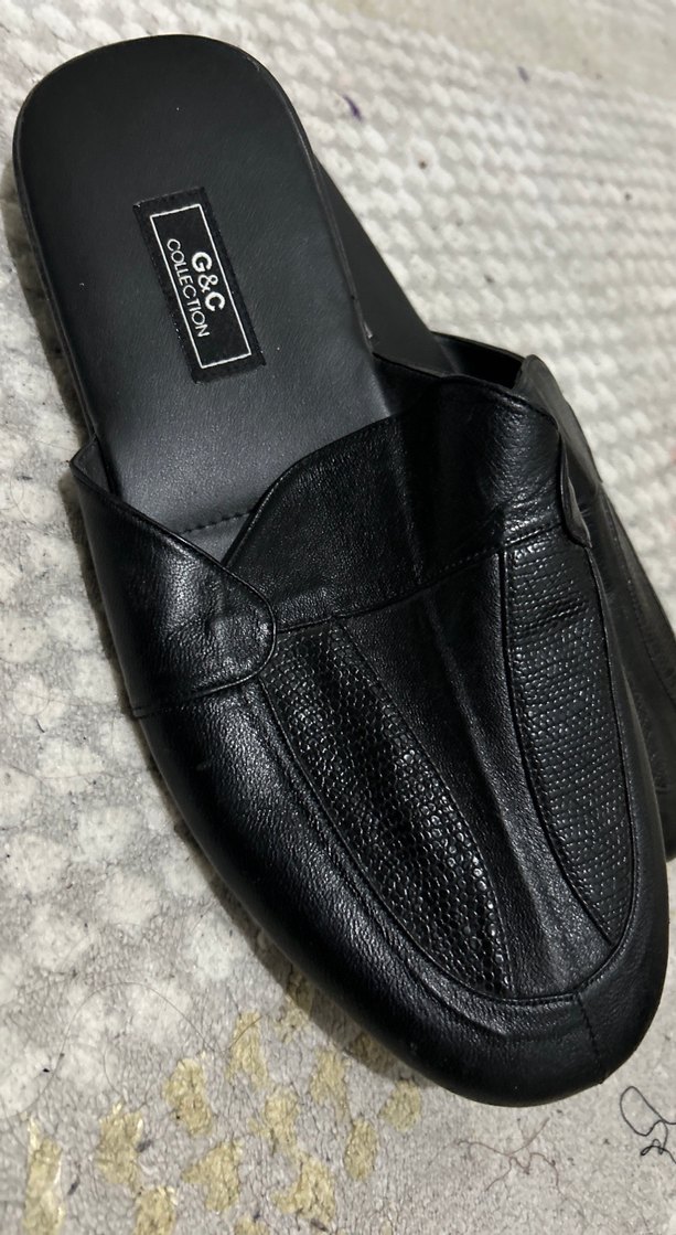 Siyah yılan desenli, tokalı erkek ev terliği. Minimalist goth tarzıyla şık ve rahat iç mekan kullanımı için uygundur.