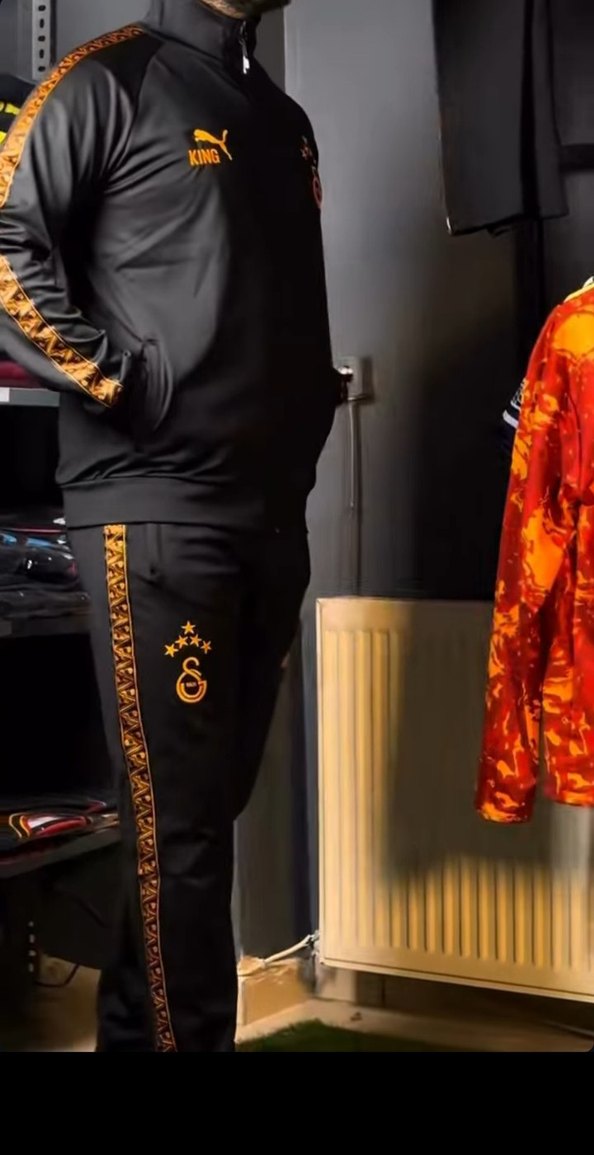 Siyah sentetik kumaştan yapılmış, yılan desenli ve zincir detaylı, regular fit ve bisiklet yaka erkek eşofman takımı.