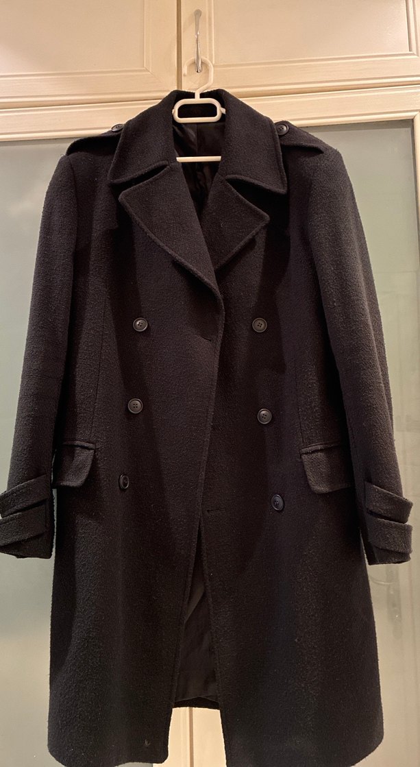 Erkek siyah yün kaban düğmeli ve kesik yaka detaylı rahat kesim