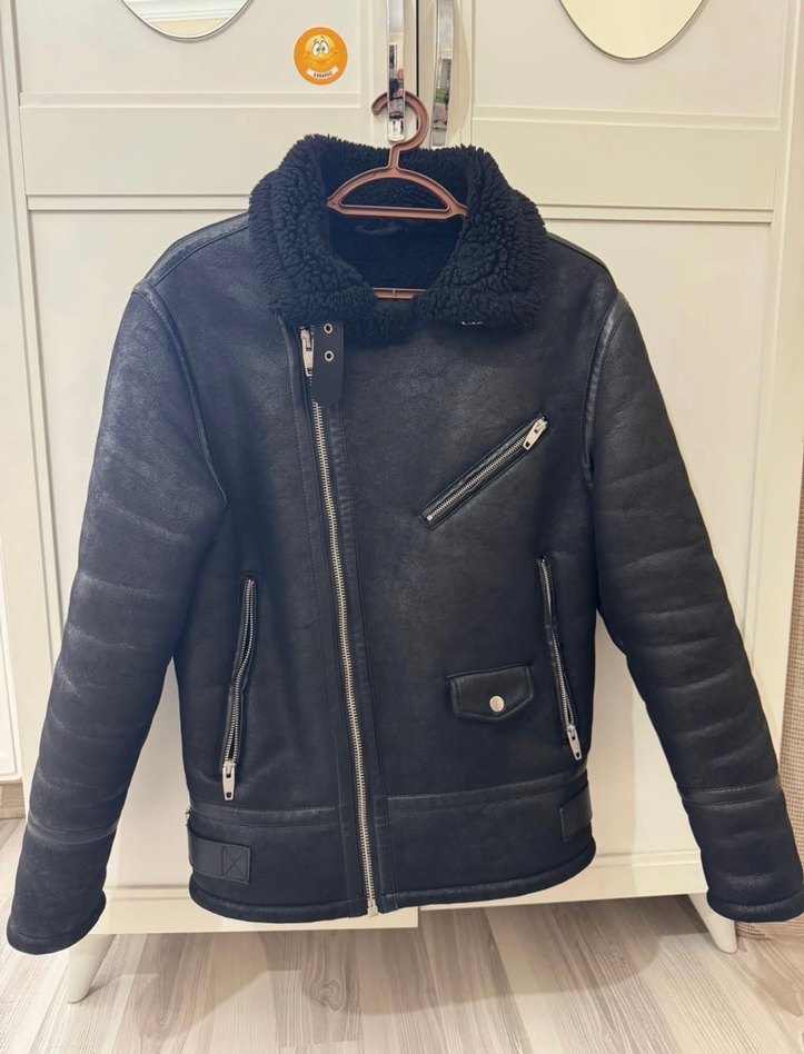 Siyah deri biker ceket, kürk detaylı, fitted midi boy, kayışlı kollar ve kesik yakaya sahip. Günlük kullanıma uygun, trend casual tarzda.