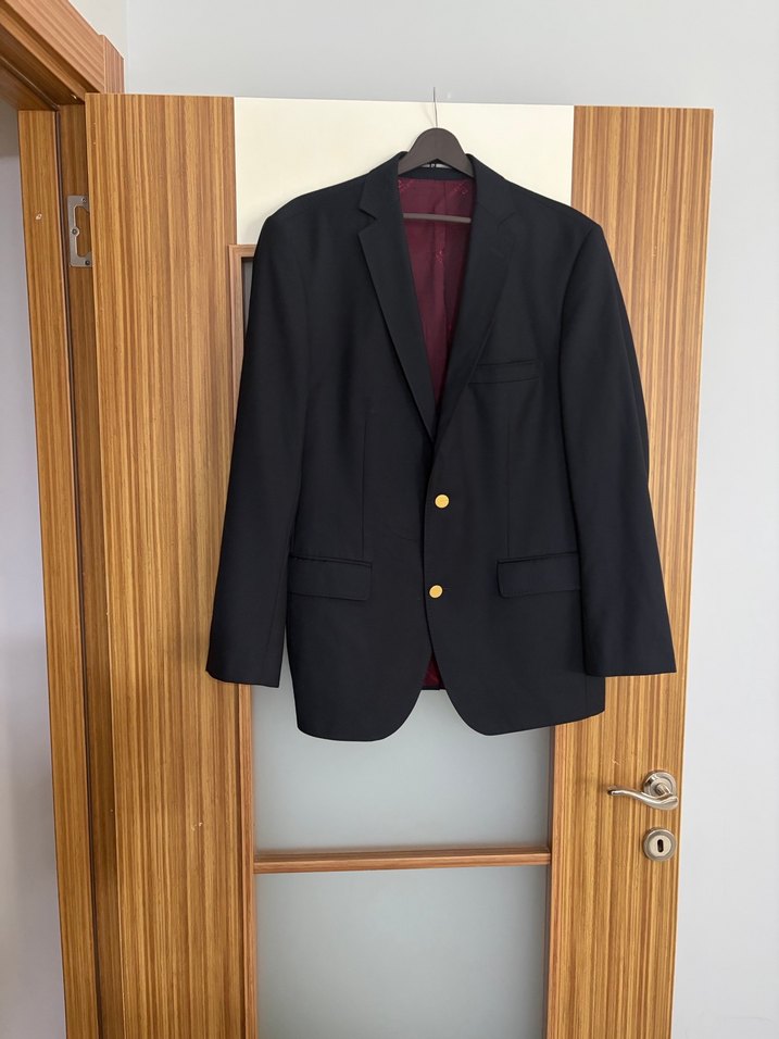 Düğmeli, klasik kesim, siyah renkte, notched lapel yakalı erkek takım elbisesi. Uzun kollu ve normal uzunlukta ofis kullanımı için uygun.