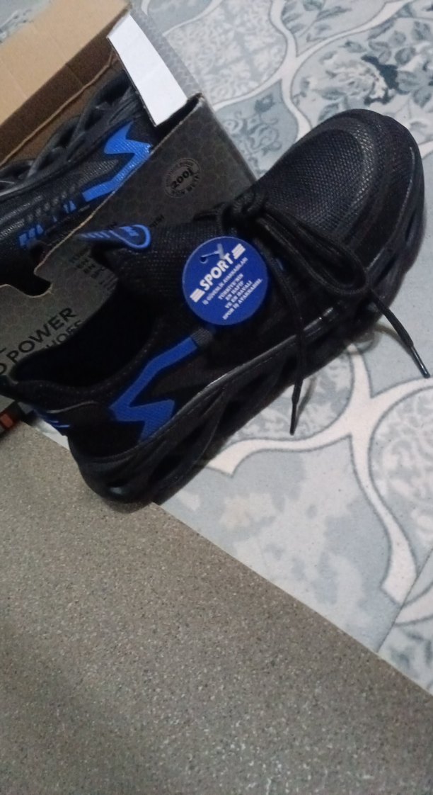 Erkekler için koyu mavi, baskılı detaylı, Velcro kapamalı, kauçuk malzemeden spor tarzda ayakkabı.