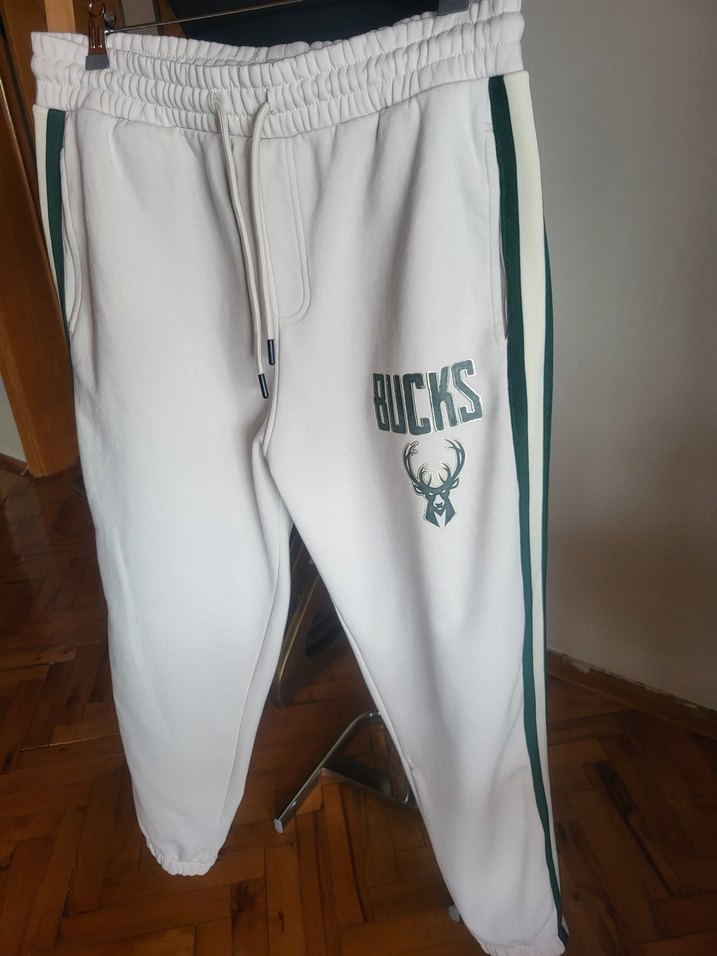erkek eşofman altı, 'BUCKS' baskılı ve geyik logosu ile. yeşil yan şeritler ve velcro detayları bulunur. Rahat, yumuşak kumaş,ufak birdefosu dışında kusuru yoktur sayılı kullanılmıştır. boy 100 cm bel 42 cm basen 58 cm paça 17 cm.dir