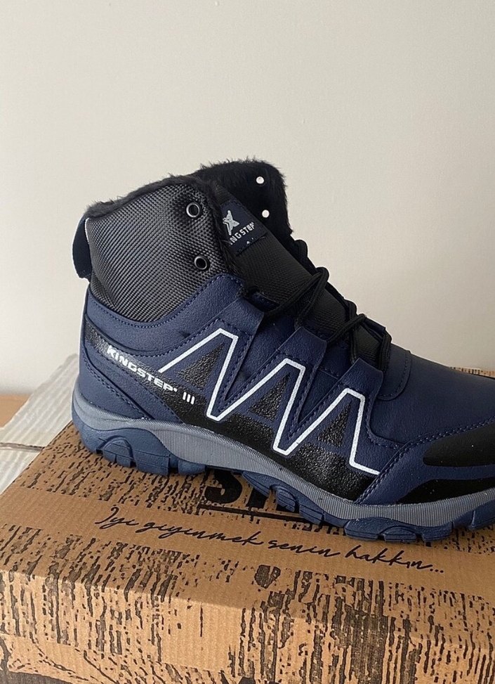 Koyu lacivert erkek spor outdoor bot, kauçuk taban ve cırt cırt detaylı. Baskılı deseni ve trend sokak stili ile şık görünüyor.