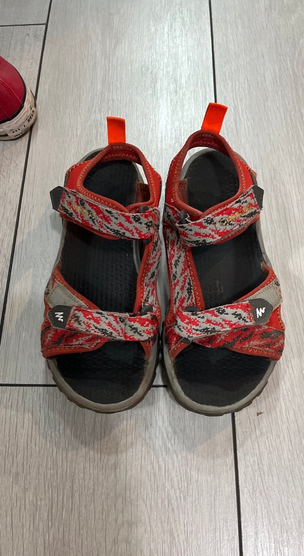 Kırmızı yılan desenli, velcro bantlı erkek spor sandalet. Kauçuk malzemeden, athleisure ve street wear tarzı için uygun.