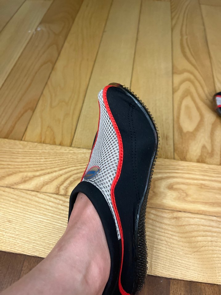 Lastik dikenli gibi tabanlı, suda giyilmesi için balık afam giysi kumaşından su ayakkabısı. Siyah üzerine kırmızı biyeli; az giyilmiş; rahat içinin tabanı vs iyi durumda
