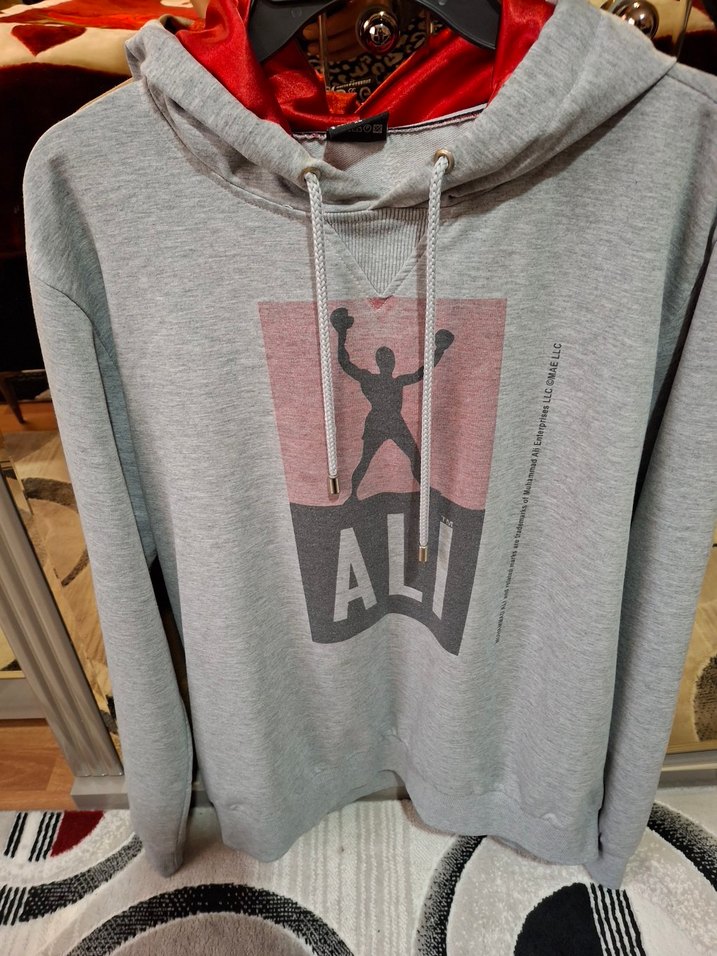 Gri renkte sweat kıyafeti. İç kısmı canlı kırmızı astarlı, hem kullanışlı hem şık.