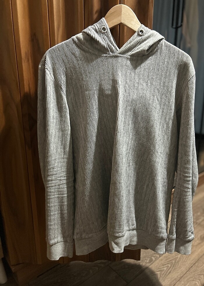 Erkek fitilli ince kumaştan sweatshirt. Kalıbı biraz dar. Boyun etiketi rahatsız ettiği için sökülmüştür.