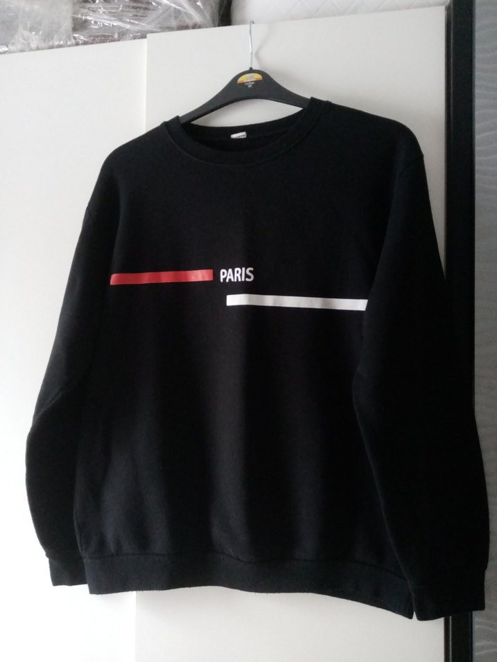 Siyah, uzun kollu, yuvarlak yakalı ve bol kesim sweatshirt. "PARIS" yazısı ve kırmızı-beyaz çizgilerle baskılı, rahat ve şık bir günlük giyim parçası. İyi durumdadır.