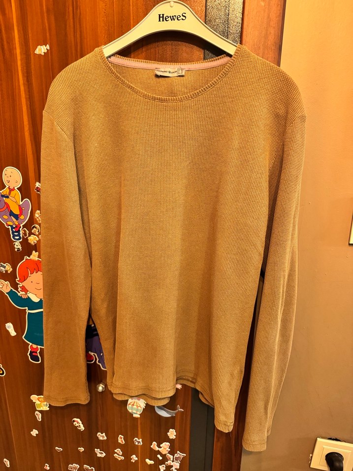 Taba, uzun kollu ve yuvarlak yakalı, triko kumaştan örülmüş, bol kesim ve normal boyda bir kadın kazak. Pastel tonlarda, desen içermez, günlük rahat sokak stiline uygundur. Hewes markalı.