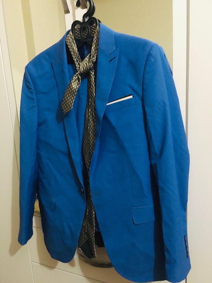 Bi kez giyildi. Eşime dar geliyor. Pantolon ceket ve kıravat.