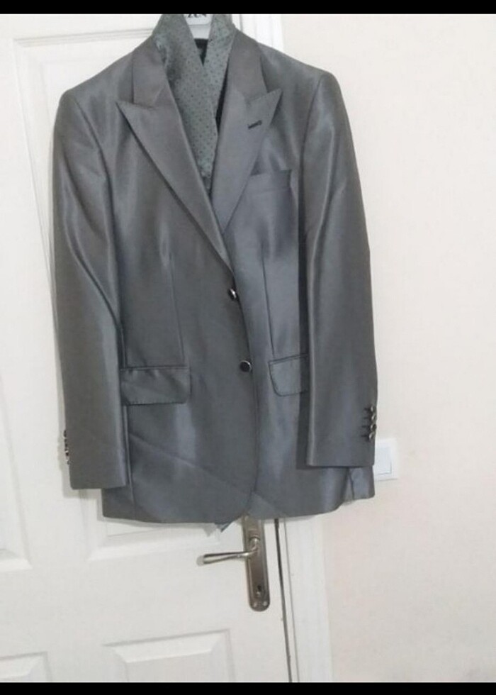 sadece 1 defa ozel günde giyildi bi kac saatligine. hic bir sorunu yoktur. parlak gri kumasi vardir. pantolon gomlek ceket ve kravattan oluşuyor.46.6 drop beden