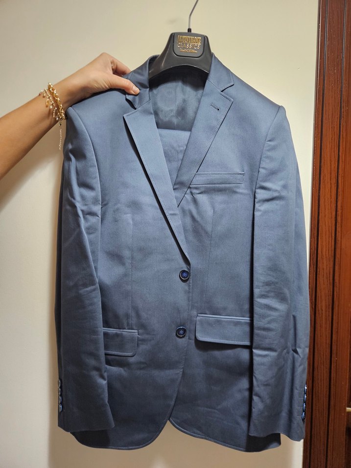 Mavi renkte, düğmeli ve klasik yakalı erkek takım elbise. Uzun kollu, italyan kesim, ofis ve özel gün kullanımı için uygundur. Tek düğmeli ve desensiz yapısı ile şık bir görünüm sunar. 48 beden, Altınyıldız markası. Herhangi bi yerinde sıkıntı yoktur, giyinen kişi 1.80 boyundadır