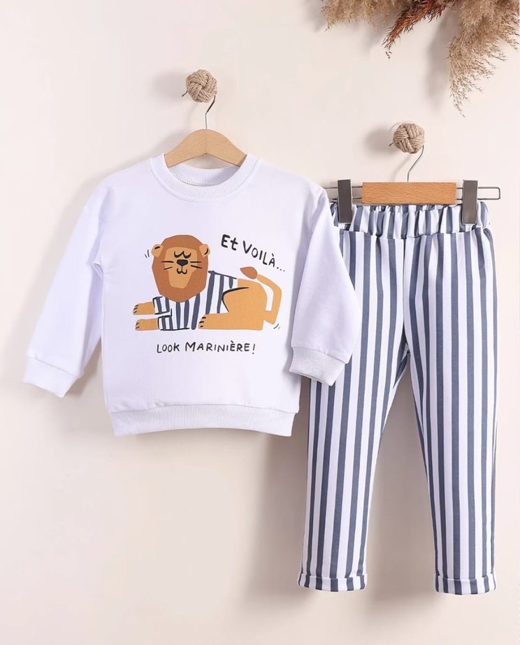 Pamuklu, uzun kollu, beyaz ve gri çizgili erkek takımı. Aslan baskılı üstü ve çizgili pantolonu ile rahat ve şık bir tarz sunar.