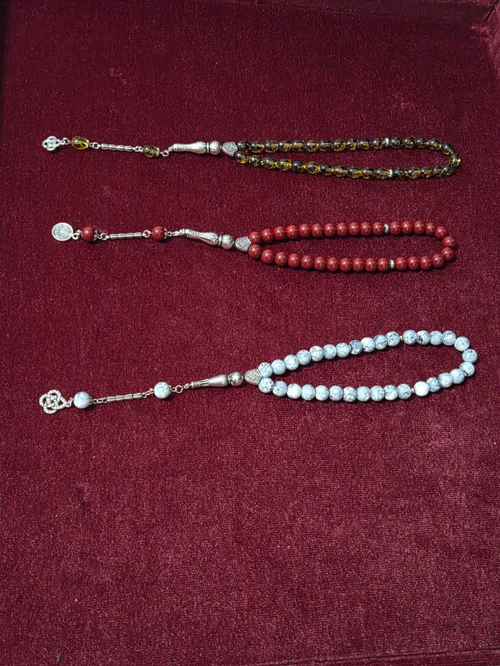 Bordo ve diğer renklerde renkli, minimalist tarzda erkekler için tasarlanmış tesbihler. Günlük kullanım ve ibadet için uygundur. 3 adet