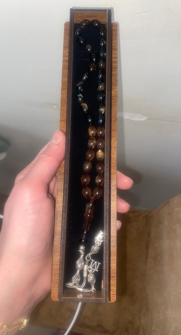 Parlak kahverengi vintage tarzında, geleneksel tasarımlı erkek tesbih, gümüş püskül detaylı. M f gümüs uclu