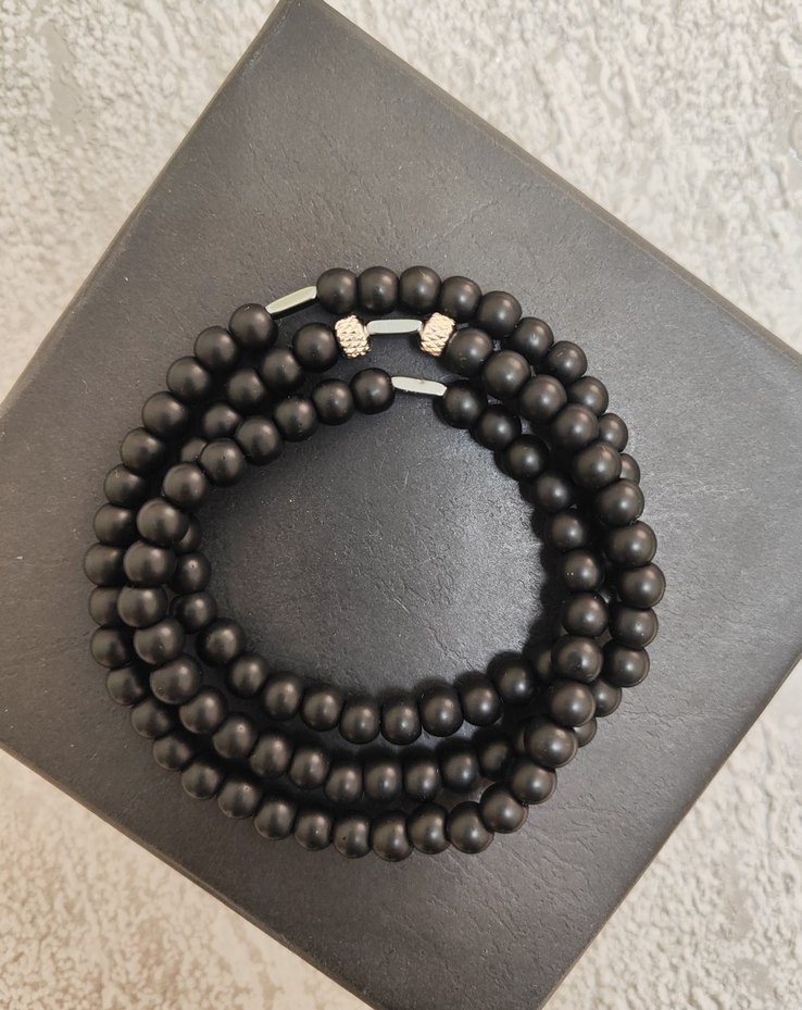 Siyah, bohem tarzda minimalist erkek tesbihi, pürüzsüz koyu boncuklar ve gümüş detaylara sahip.
