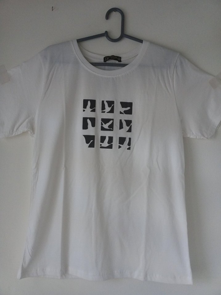 hiç giyilmedi. Gri baskılı, kısa kollu, yuvarlak yaka, pamuklu, bol kesim beyaz hamile tişörtü. Günlük kullanıma uygun rahat model.