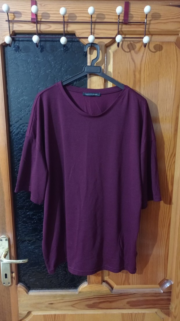 Erkek L bedendir bordo renkli, kısa kollu ve yuvarlak yakalı. İpek gibi yumuşak kumaştan, günlük kullanım için minimal ve rahat tarzda.