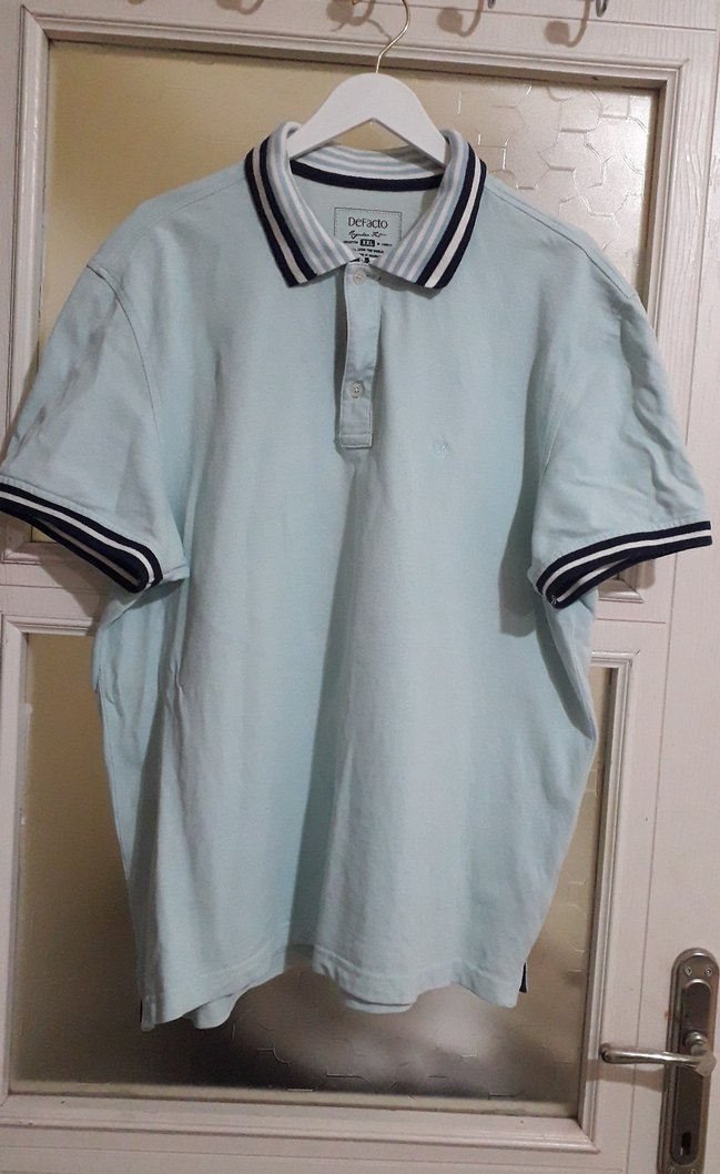 Açık mavi pamuklu erkek polo tişört, düğmeli ve yakalıdır. Kısa kollu, çizgili kenarlara sahip ve bol kesimdir. Günlük rahat sokak tarzı için uygundur.