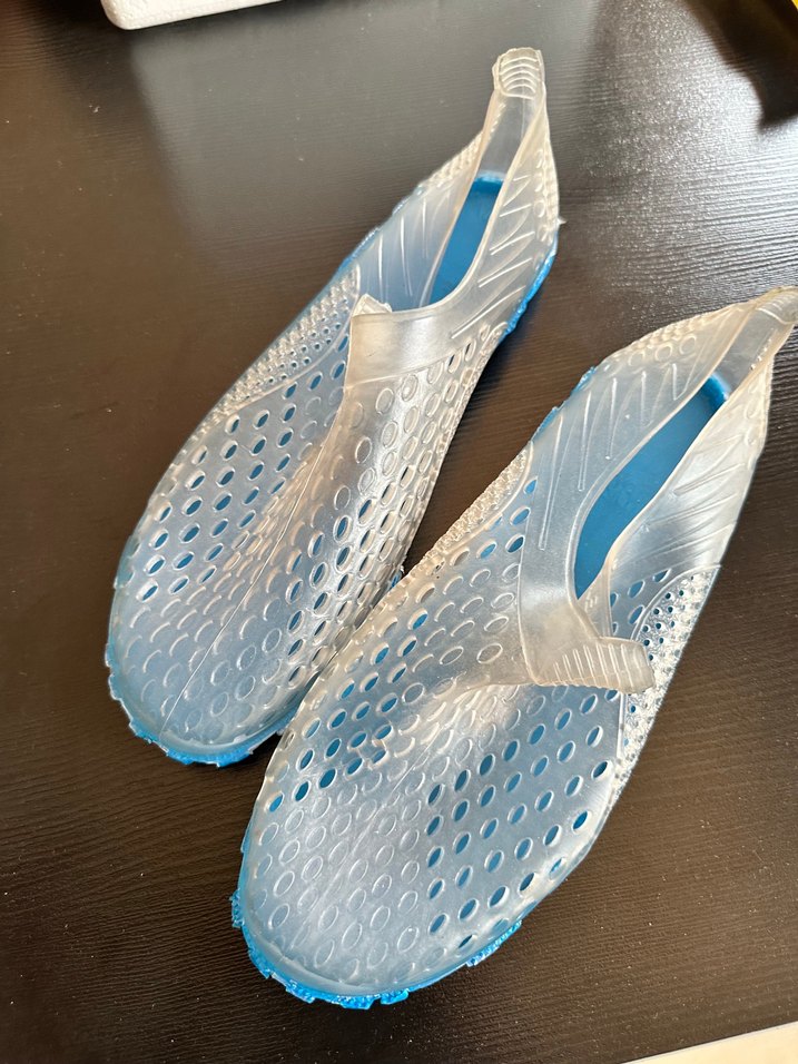 Erkekler için transparan tasarımlı, pastel mavi renkli, delikli kauçuk su ayakkabısı. Bohem tarzıyla athleisure havası yakalar.