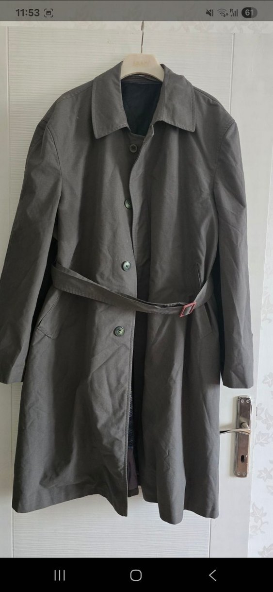 yeşil renkte, uzun erkek trençkotu, kemerli ve yakası kesik. Sentetik kumaştan, uzun kollu ve düz desensiz. Günlük sokak stili için uygun boyu 110 cm iki koltuk arası 71 cm