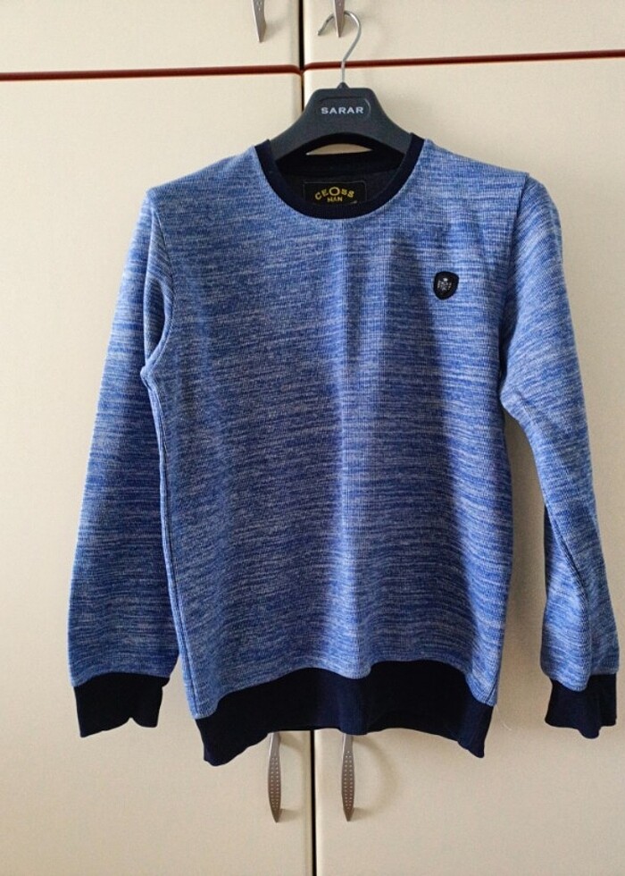 M beden için uygun mavi kırçıllı kış veya baharlık erkek kazak malzeme etiketine bakabilirsiniz