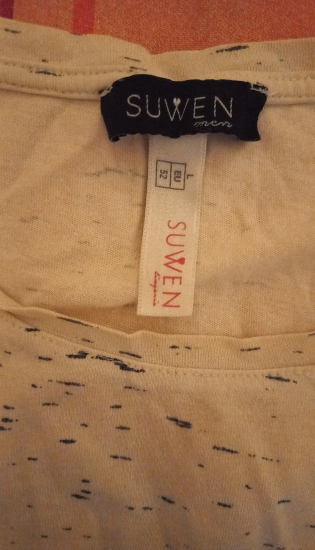 SUWEN markalı, parlak krem rengi bohem tarzda erkek tşört Üzerinde SUWEN etiketi bulunan dikkat çekici bir tasarım.