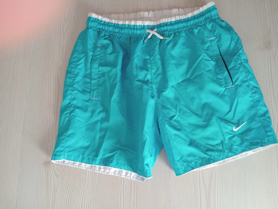 Parlak turkuaz renkte, düğmeli detaylı, bol kesim erkek mini şort mayo, plaj ve sokak modasına uygun.