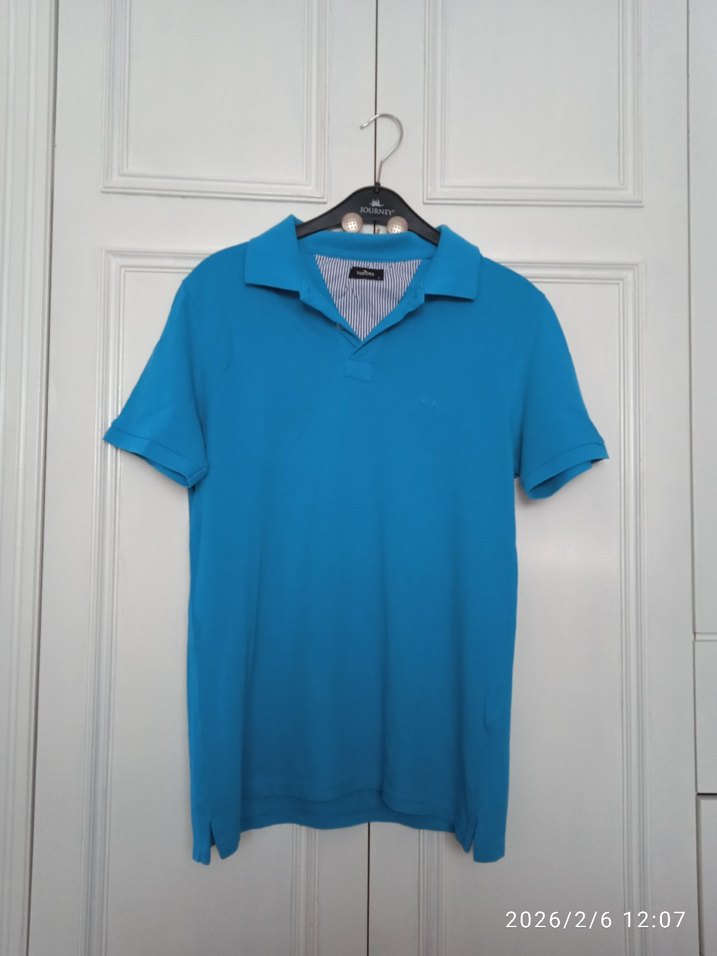 Erkekler için polo yaka, kısa kollu, nefes alabilir pamuklu kumaştan yapılmış, turkuaz renkte, günlük kullanım için uygun şık ve rahat bir tişört.