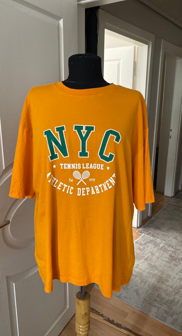 Turuncu renkli, kısa kollu ve yuvarlak yakalı , oversize tişört .