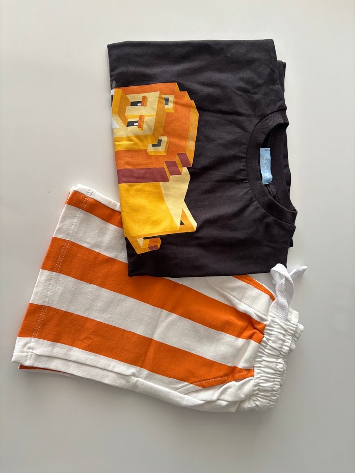 Erkeklere özel, baskılı kısa kollu, turuncu renkli tişört ve turuncu-beyaz çizgili elastik bel kısa şortlu rahat takım. 2/3 yaş