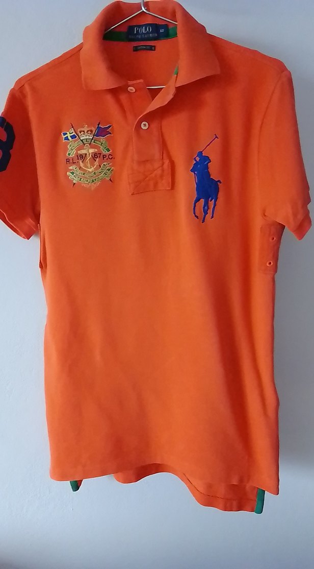 Erkekler için turuncu renkli, kısa kollu, düğmeli polo tişört. Baskılı desenli, bol kesim ve sentetik kumaştan, günlük rahat stil için uygun.