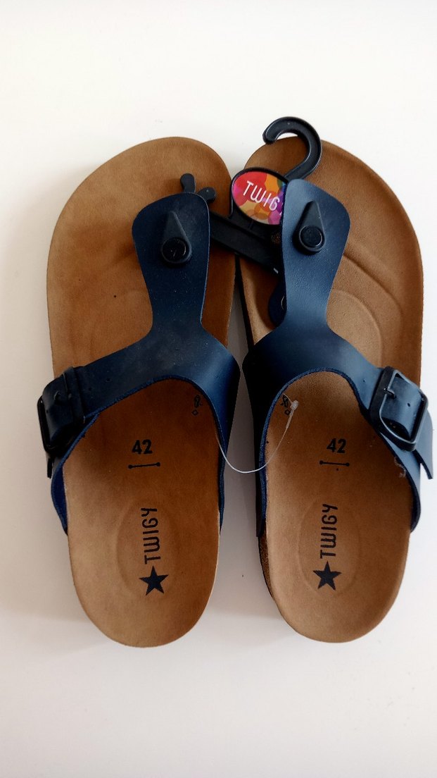 Erkekler için tokalı, koyu mavi kauçuk terlikler. Rahat kahverengi tabanlı, günlük ve sokak stili için uygun. Numara 42.