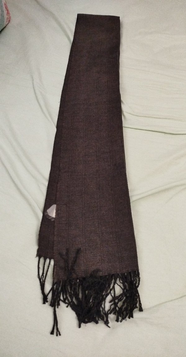 Uzun, koyu kahverengi erkek atkısı, sade ve desensiz tasarımıyla bohem tarzda. Saçaklı uçları vardır ve sıcaklık sağlar.