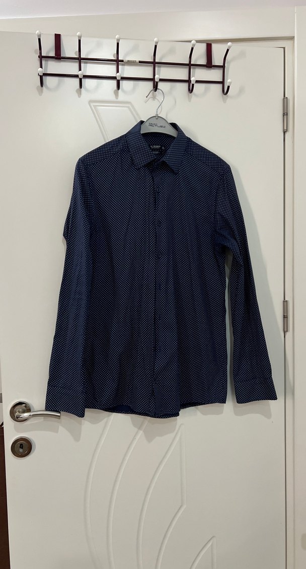 Erkekler için uzun kollu, yakalı ve düğmeli gömlek. Normal kesim, koyu mavi batik desenli ve sentetik kumaştan üretilmiştir. Ofis ve günlük kullanıma uygundur.