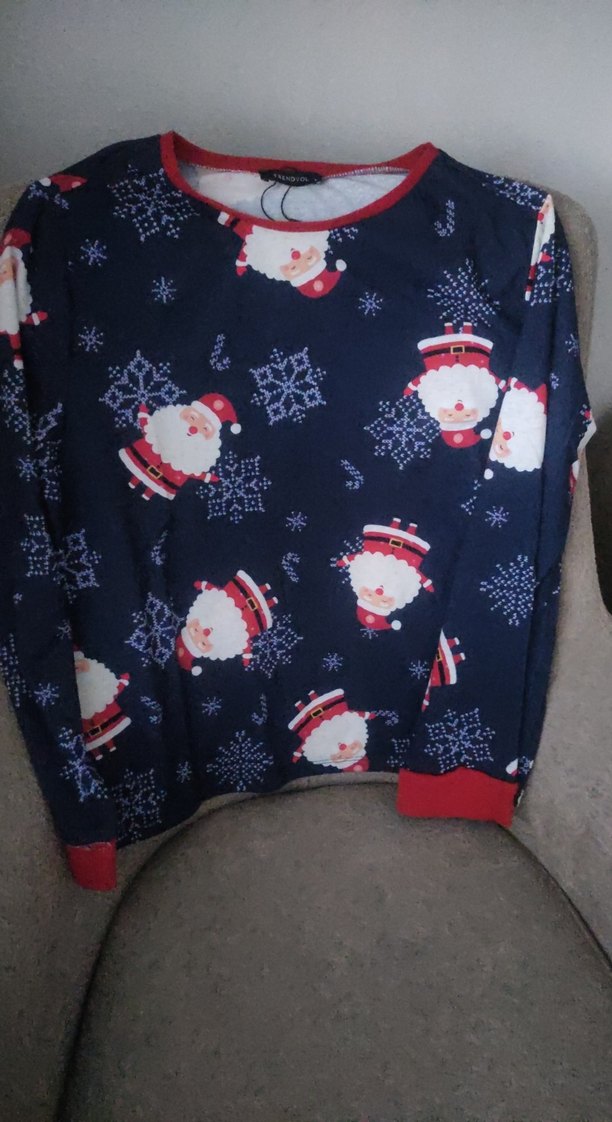 Erkekler için uzun kollu, yuvarlak yaka, ince kesim ve örme kumaştan yapılmış, kar taneleri ve Noel Baba baskılı koyu renkli pijama üstü.