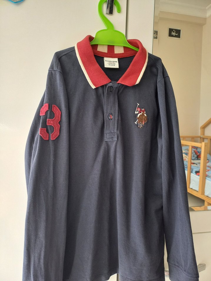 Uzun kollu, düğmeli polo yaka tişört. lacivert renkli, baskılı detaylı ve kırmızı yakalı.