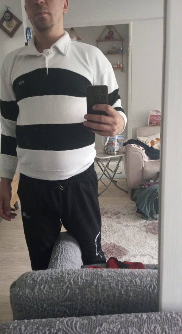 Erkek kazak fitted kesim, normal boy, uzun kollu ve bisiklet yaka. Düğmeli ve siyah beyaz çizgili desene sahip, rahat kullanım için uygundur.