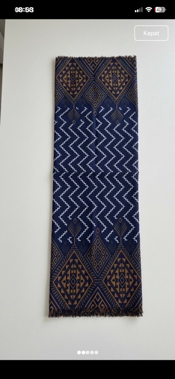 Erkekler için uzun, mavi renkli ve bağlama desenli atkı. Bohem ve retro tarzını yansıtan geometrik desenlere sahiptir.