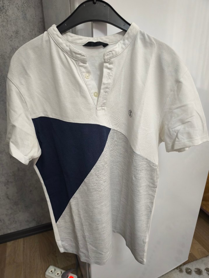 Pamuk kumaştan üretilmiş, V yaka ve kısa kollu erkek polo tişört. Düğmeli yakası ve beyaz, gri, lacivert geometrik baskısı bulunur. Rahat kesim, günlük sokak stili için uygundur.